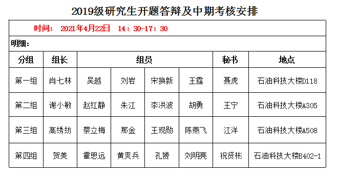 通知:公司将于2021年4月22日下午2:30进行公司2019级研究生开题答辩及中期考核,具体安排如下: