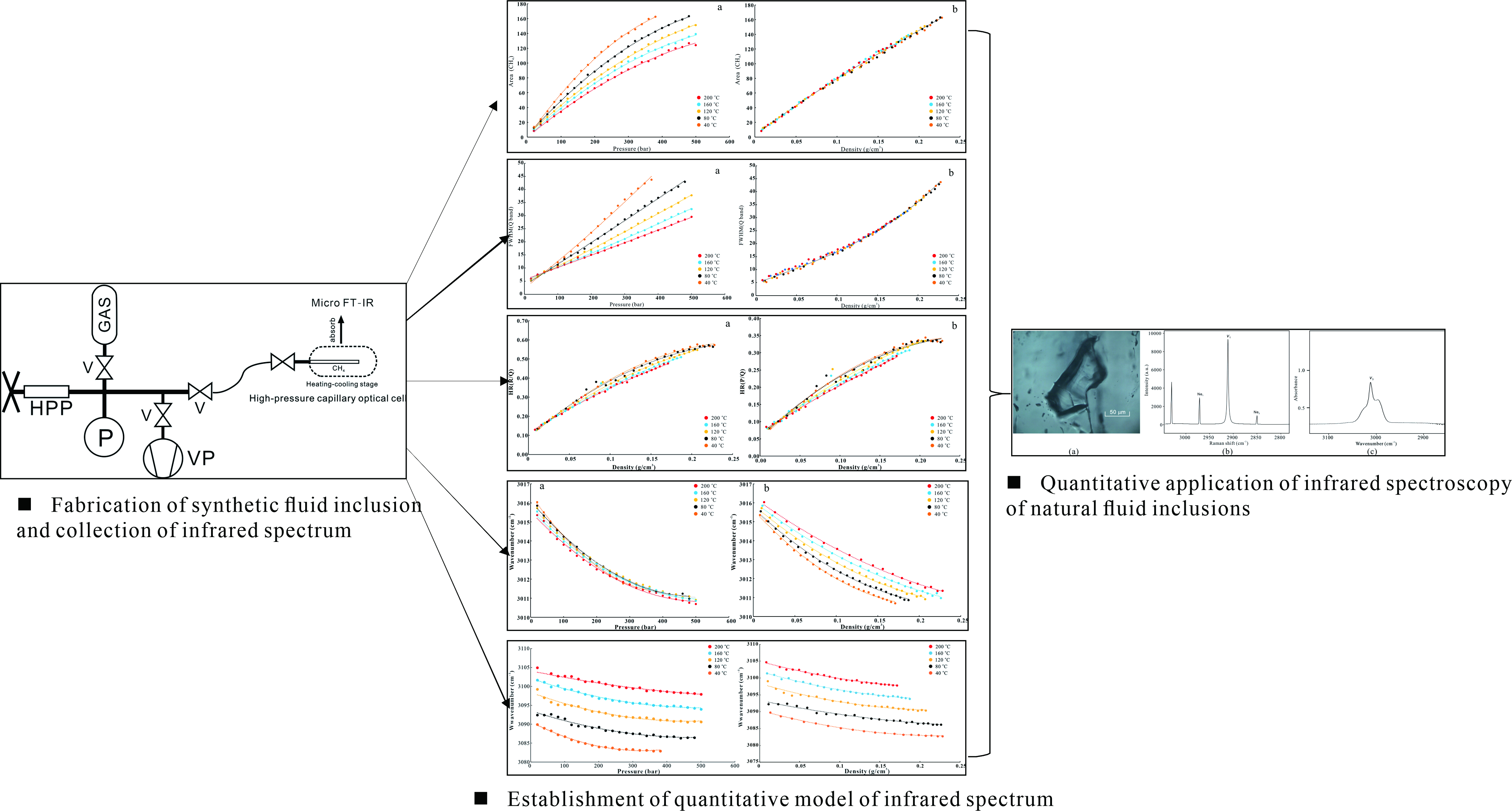 本次研究首次建立了甲烷(40-200oC,2-50 MPa)和二氧化碳(40-120oC,6-50 MPa)体系下傅里叶红外光谱参数与温度-压力-密度的定量模型(图1),同时分别对阿尔卑斯山中央区石英脉体内多个纯甲烷天然流体包裹体和莺歌海盆地的纯二氧化碳流体包裹体应用了傅里叶红外光谱的定量方法,此研究不仅创新性的采用傅里叶红外光谱定量分析应用于流体包裹体地球化学研究方向,同时比较了傅里叶红外技术与激光拉曼技术的优缺点,为下一步含甲烷和二氧化碳多元体系傅里叶红外光谱定量打下了基础。黄亚浩为论文第一作者,合作者包括英国上市官网365文志刚教授、中石油勘探开发研究院陶小晚高工、杭州地质研究院乔占峰教授等。该研究得到国家自然科学基金资助项目支持。(审核 孟强)