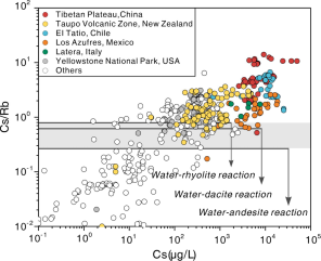 (2)对于大部分地热系统,水–岩反应是高温地热流体中Li、Rb、Cs的主要来源机制。然而,在部分锂、铷、铯富集程度极高的地热系统(如中国藏南、新西兰Taupo Volcanic Zone、智利El Tatio等)中,地热水中普遍表现出Cs含量高于Rb的反常特征,这一现象难以通过常规的水–岩反应或次生矿物吸附机制予以解释(图2,图3)。结合构造与岩浆活动背景推测,这类系统极有可能受到高分异岩浆流体的持续影响,从而诱发了Rb与Cs之间的分馏行为。