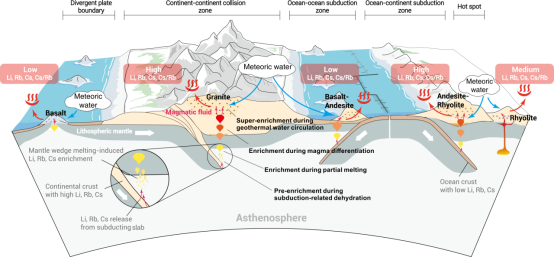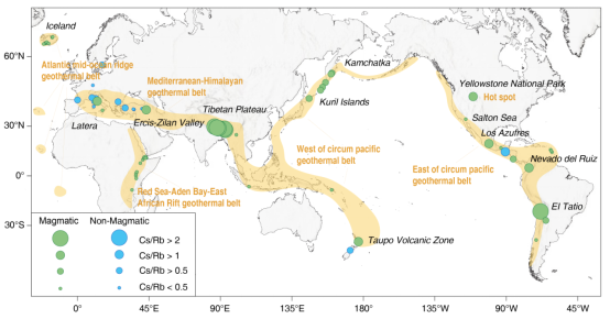 (通讯员 刘明亮)锂(Li)、铷(Rb)、铯(Cs)是现代新能源与高端技术产业中极具战略价值的稀有金属。近年来研究发现,高温地热系统排放的地热水中常富集这些元素,部分地热系统中其浓度甚至超过工业开采品位,展现出可观的资源潜力。然而,关于这类流体中锂、铷、铯的来源机制仍存在争议:究竟是水–岩反应主导了元素富集,还是深部岩浆流体的输入在其中起决定性作用?这一问题不仅关系资源开发前景,也反映了地热系统内部关键地球化学过程的深层动力学。