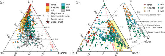 图2 全球地热带不同类型岩石(a)与岩浆–热液系统地热水中锂、铷、铯的三元图