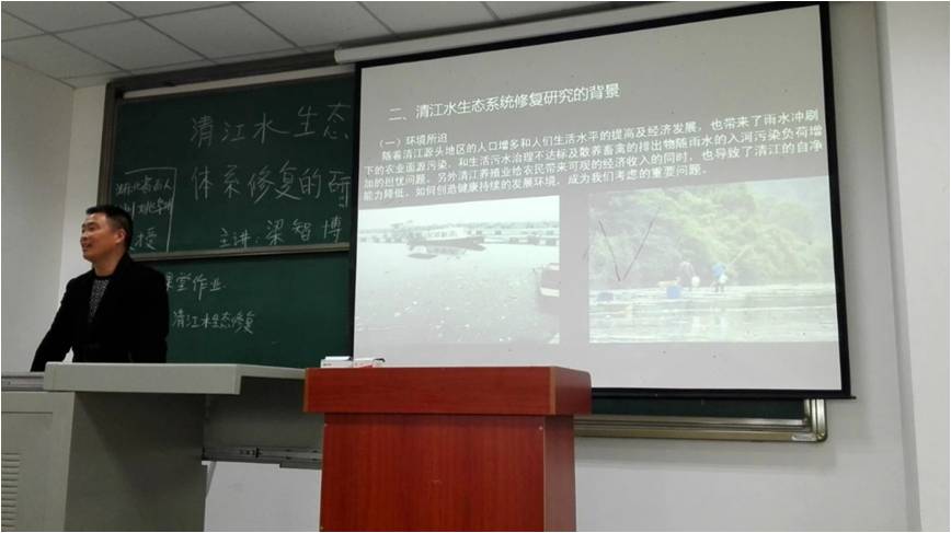 接着,梁智博老师分别从清江水生态体系修复的构思、背景、历程三个方面开始了讲座,提出了具有造血功能的生态治理模式。这种模式通过巧妙的生态设计,能够达到科学的协同共生,实现资源的合理化利用。其次,对于当遇到水体富营养化这类棘手的问题应如何解决以及如何将这些营养物质转换为资源再利用等问题,梁智博老师也进行了详细的解析。台下不时响起热烈的掌声。在梁智博老师回答了同学们提出的问题后,为了让同学们能够更加直观地了解相关知识,做到理论与实践并存,老师带领着同学们参观了公司的教学与科研基地进行参观。