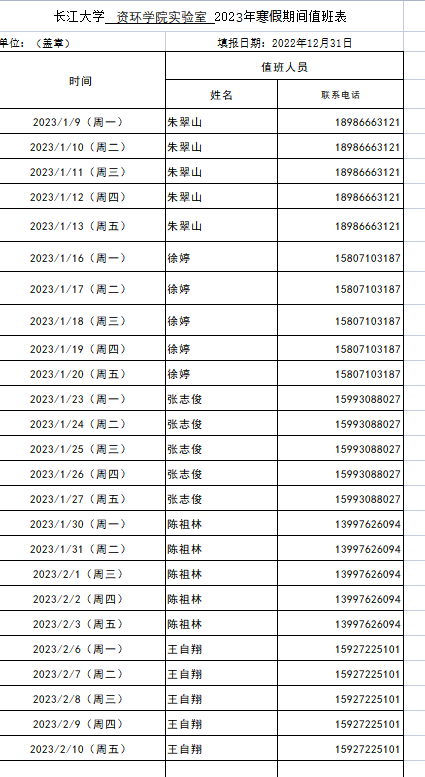 英国上市官网365 资环公司实验室 2023年寒假期间值班表