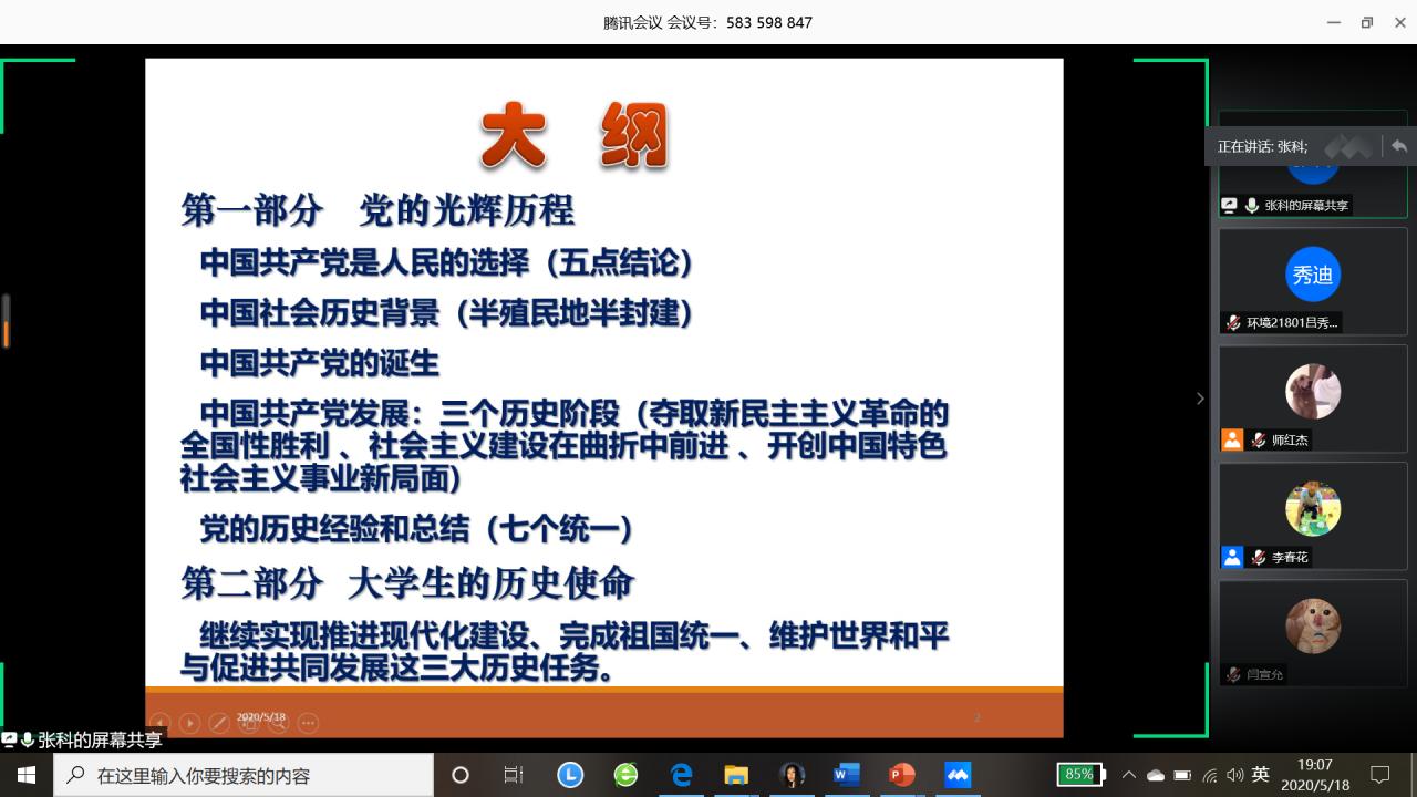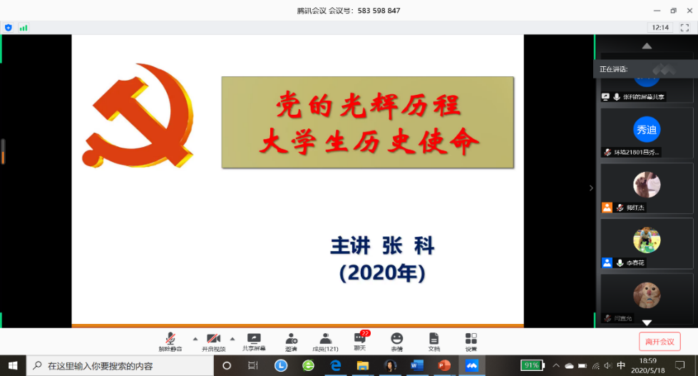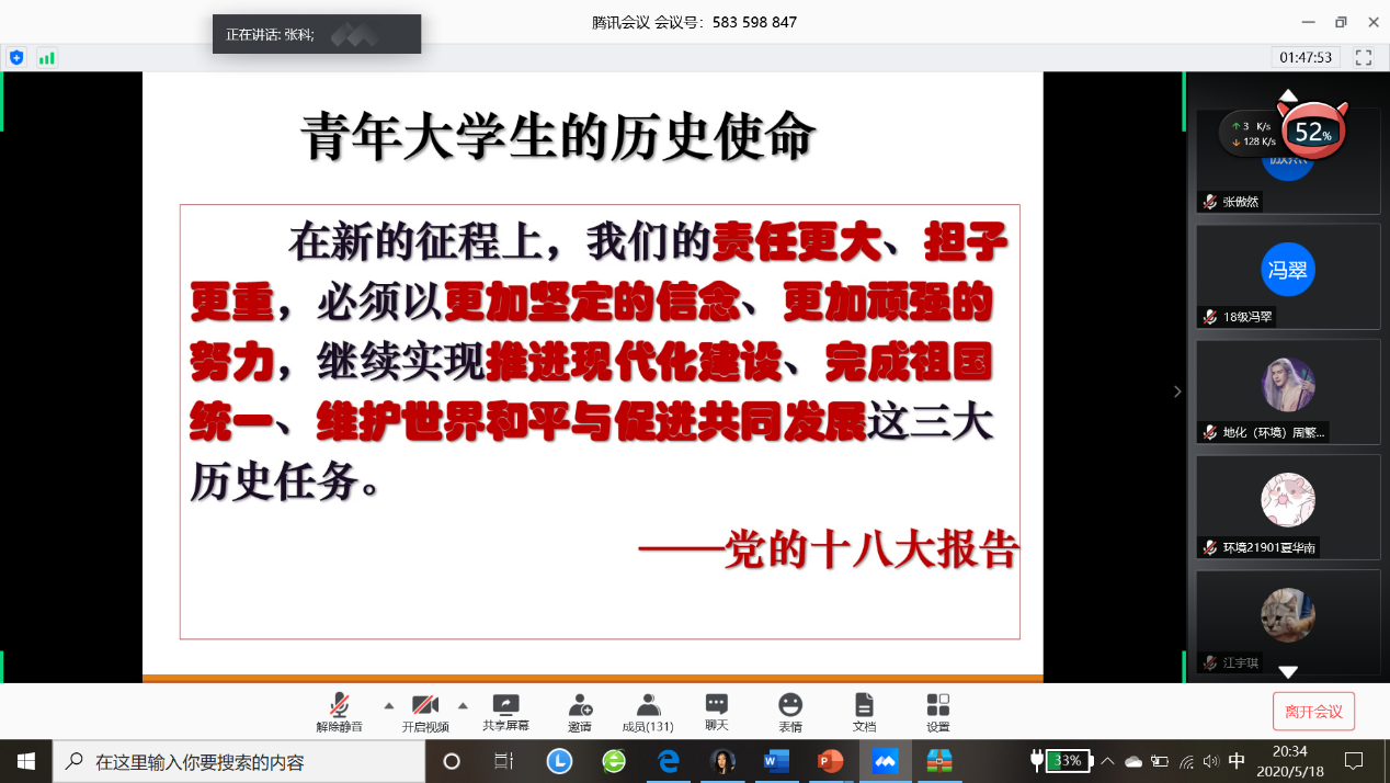 (图/文:吕秀迪)为进一步做好资源与环境公司党员发展工作,加强对发展对象和入党积极分子的教育和培养,引导其提高思想觉悟,保证发展新党员的质量。资环公司于2020年5月18日晚19:00以线上腾讯会议的形式举行了2020年上半年入党积极分子和党员发展对象培训会议。资环公司党委书记张科主讲,党委副书记范梅英参加、本科员工工作党支部书记李春花主持,共130余名入党积极分子和党员发展对象线上学习。