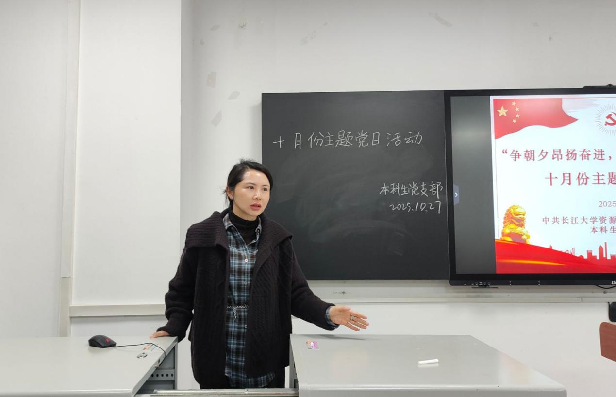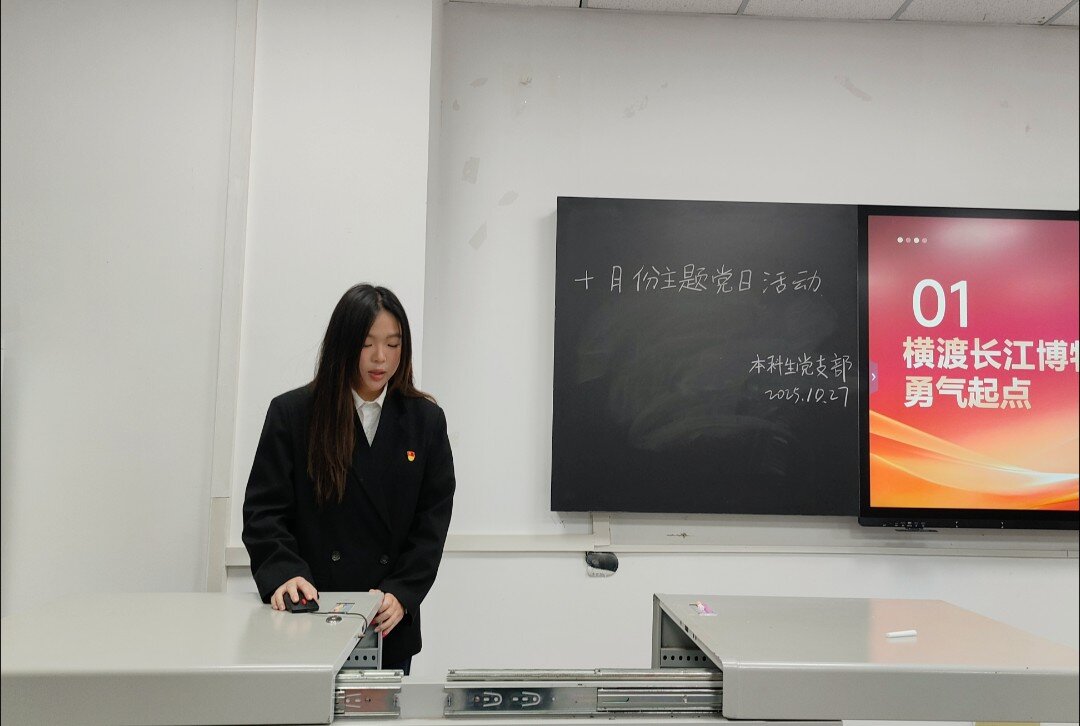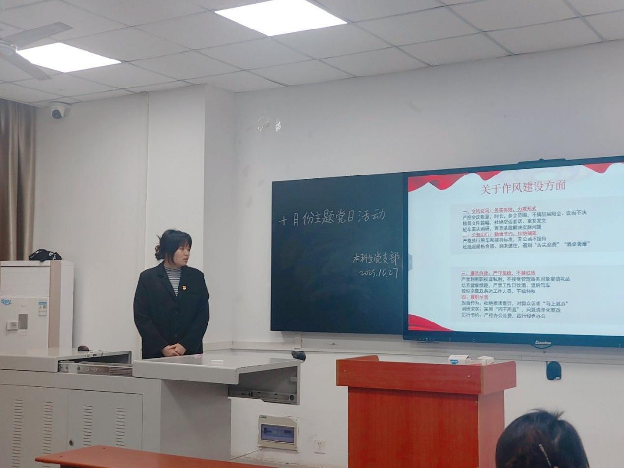 (通讯员 谭润格)2025年10月27日下午6:00,本科生党支部于武教A101召开“争朝夕昂扬奋进,搏浪潮锦绣新篇”十月支部主题党日活动。本次活动由黄宇同志主持,党支部书记刘娥老师及全体员工党员参加。 会议伊始,黄宇同志带领全体党员进行总纲学习,深入剖析党的章程。随后由黄若曦同志以“走读红色沃土,砥砺奋进初心”为主题开展微党课学习,呼吁广大同志在面对苦难挫折时要坚定理想信念。接下来,由王艺燃同志讲授微党课,聚焦中共八项规定精神,分析典型案例,进一步强化全体党员的纪律意识。同学们就“如何立足岗位,服务中国式现代化建设”主题展开交流研讨。党员同志们从理论和实际两方面深入探索,表示不仅要提升专业能力,更要培养创新精神,将个人理想与国家未来紧密结合,听党话,跟党走。 活动结束后,刘娥书记总结发言。她对本次活动的组织成效给予肯定,同时要求全体员工党员,要持续深入学习党的理论,扎实做好党建联系人工作,并坚持知行合一,将热情转化为脚踏实地、真抓实干的具体行动,展现党员担当。(审核 李春花)