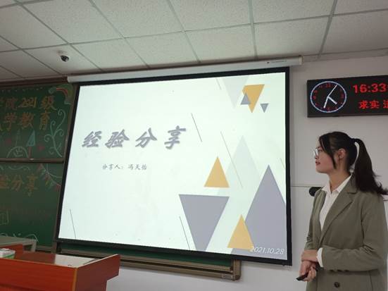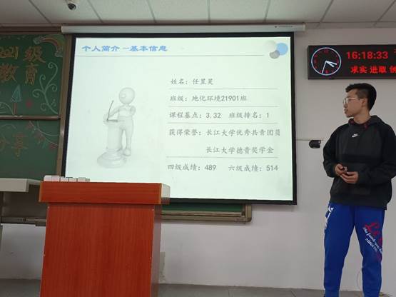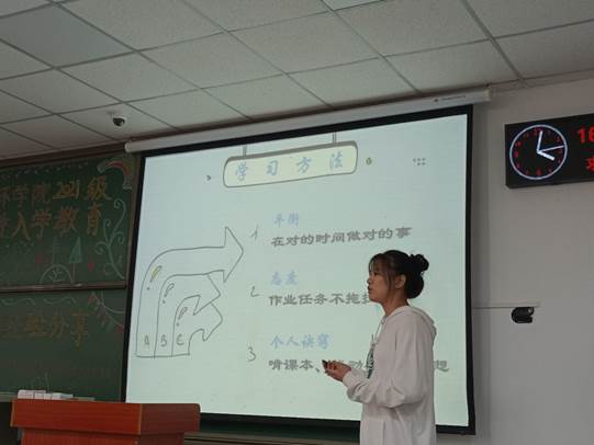 会议伊始,环科类22101班班导王云从“学习”,“科研”,“四六级”三个方面阐述了自己的学习方法以及奋斗方向。她重点介绍了自己的科研项目,通过具体的描述以及研究过程的图片向大家展示了自己的大创团队取得的成果。“我也是普通人,大创项目不需要多高的天赋,只要努力就可以。”她这样鼓励新生,希望让新生们明白科研并不是遥不可及的神话,而是努力去做就能收获很多的一项有意义的事情。