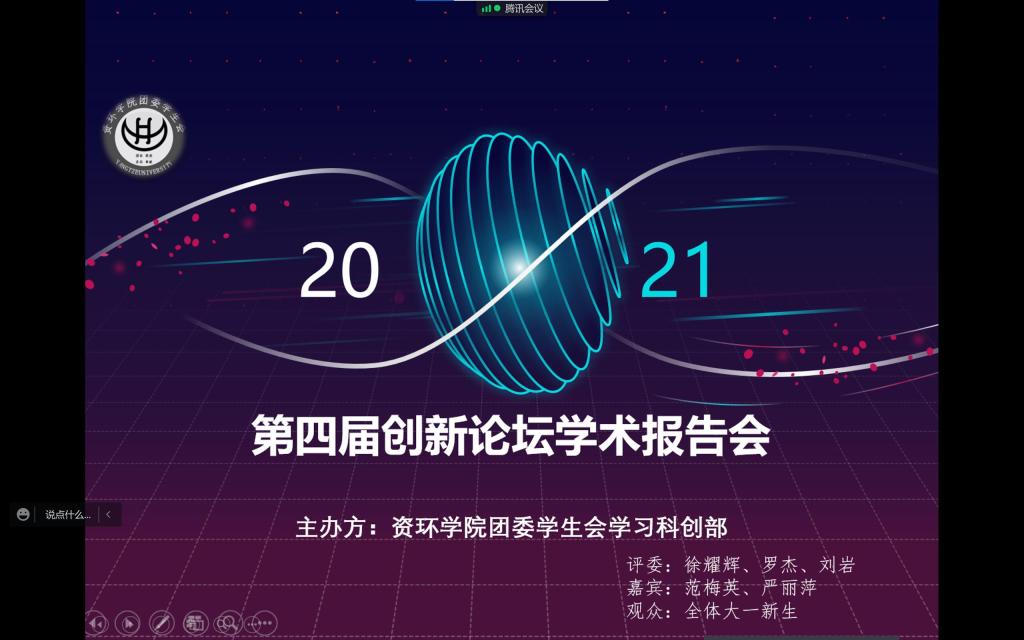(通讯员 王泽瑞 图/文)11月28日19:00,为展示公司老员工的优秀科技成果,培养员工的创新意识和创新能力,促进学科的交叉融合。资环公司第四届创新论坛学术报告会于线上隆重举行。本次活动由资环公司团委员工会主办,学习科创部承办,副经理徐耀辉教授、刘岩教授、罗杰教授担任评委,党委副书记范梅英老师、团委书记严丽萍老师担任嘉宾出席,资环公司2021级全体员工进入视频会议参会。
