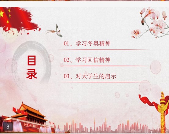 会议开始,各班班委都先向同学们简单介绍了冬奥精神与回信精神的丰富内涵,并说明了学习这两种精神的重要性,并向同学们展示了此次班会内容目录:主要分为“学习冬奥精神、学习回信精神、对老员工的启示”三个方面。同时,在学习过程中,同学们也从总书记的话语中感受到了青年一代的任重而道远。我们作为新时代的青年人,要谨记总书记的嘱托,志存高远,脚踏实地,把青春和热血投入到为祖国人民的服务中去。