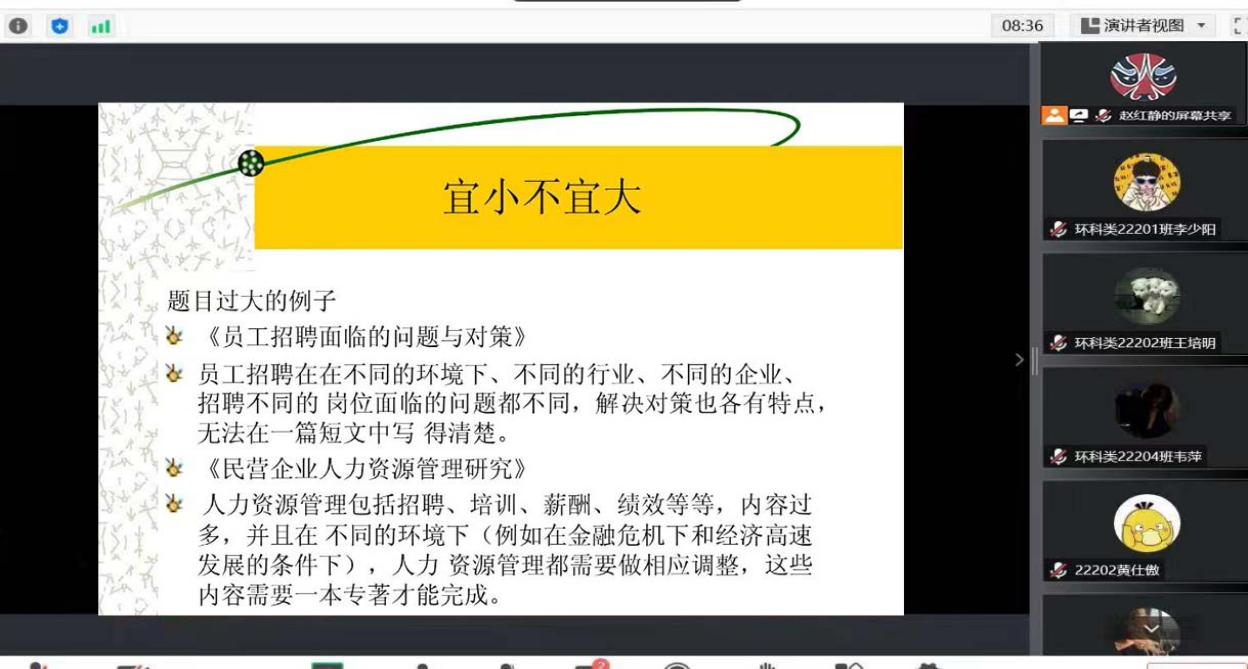 (通讯员 杨照辉 图/文 )为培养同学们的学术思维和专业素养,整体提高同学们的实践撰写水平,将来更好地完成学业和就业,英国上市官网365于2022年10月20日下午19时整在腾讯会议,邀请到赵红静老师为同学们带来了一场题为“论文指导促成长”的精彩讲座。党委副书记范梅英老师出席本次讲座,全体大一同学和部分大二大三同学参与其中。