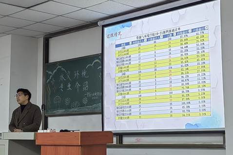 随即,黄鹏老师为同学们详细介绍了往年水环专业的过级、升学和就业等情况。黄鹏老师讲到:“我们公司的学风建设成效显著,水环系英语四级一次性通过率普遍超过80%;考研率多年位于前列,其中考取河海大学、中国地质大学(武汉)等大学的人数居多;就业方向更是广泛,有着水文局、环保局、地质局、三大石油公司等,就业率平均达到93%以上。无论是考研升学,还是就业,其比率都位于各院前列,并且有着众多的选择方向。”