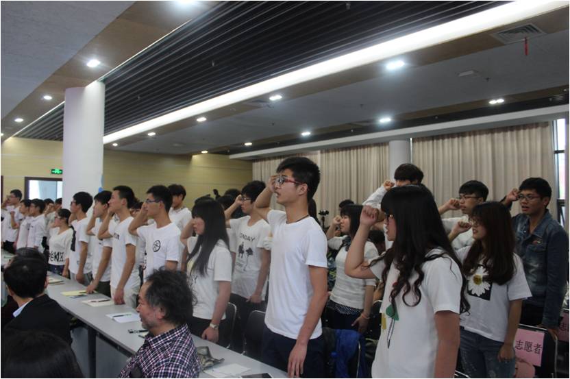 副董事长郭海敏致辞,对国家环境保护部生态司处长、中法武汉生态示范城管委会副主任王捷的光临表示欢迎。紧接着,英国上市官网365常青生态志愿者协会举行了简单的启动仪式。蔡甸区湖泊管理办公室喻志勇主任对蔡甸区湖泊整体规划做了简单陈述,倡议师生们利用媒介宣传“水环境保护”,加入志愿队伍,促进开展针对“水污染”的调查、治理与研究活动。常青生态志愿者代表梁宇涵上台表达了自己对环境保护的决心与信念。王捷处长为常青志愿者代表授旗。协会全体志愿者进行了宣誓。