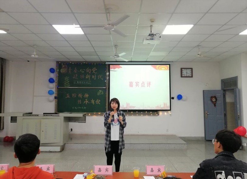 再者,朱吉华、陈倩倩、李广鑫、贺武明四位同学带来了诗朗诵《青春万岁》并带领全体人员共唱团歌《光荣啊!中国共青团》,本次活动在振奋人心的音乐声中接近尾声。最后,刘娥老师对本次活动进行点评,对于传承并发扬五四精神的正能量给予了肯定。