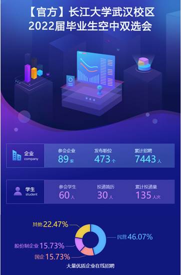 参加本次双选会的企业共有89家,共发布职位数量473个,招聘人数7443人。参加本次双选会的员工共有60人,参与投递人数30人,简历投递量135份。公司员工积极踊跃地参加了此次线上双选招聘会,报名人数占总人数的24.32%,报名人数位居各公司第二。