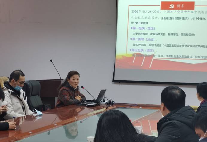 贾廷秀教授以《擘画发展新蓝图 开启美好新征程——学习党的十九届五中全会精神》为题,为资环公司教职工以及员工党员进行了宣讲。会议总共分为三个板块,第一板块为大家阐述了近年来中国取得的成就以及党的指导思想,原则以及目标,第二板块按十二个部分,分领域阐述了“十四五时期经济社会发展和改革开放的成果”,最后贾教授进行了结束语讲解,阐述了加强党的统一集中领导,推进社会主义政治建设的重要性。会议中贾教授旁征博引,中西对比、声情并茂,以文字与视频相结合的形式详尽阐释了“精准扶贫”、“绿色发展”、“循环经济”、“碳中和”、“新发展理念”、“微笑曲线”等概念。生动形象的为广大师生讲解了十九届五中全会所提出的内容对深入学习领会党的十九届五中全会精神,把学习成效转化为工作的强大动力具有重要指导意义。