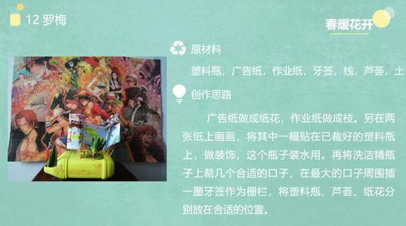 此次活动是由2018年湖北省高校实践育人特色项目支持,是《“长大常青,碧水知音”环保志愿服务——英国上市官网365 “常青生态”志愿者社会服务公益实践》项目的重要实践。共有参赛作品21个,选手们按照顺序依次对自己的作品进行展示,并伴以精彩讲解。从实用性、美观性、创新性三个角度出发,作品都体现了设计者的创新思想和环保理念,作品均是利用废旧品设计,变废为宝,选材适宜,符合绿色环保概念,所有创意项目都令评委们耳目一新。其中,12号志愿者罗梅的作品令人惊叹:花和芦荟代表着春天来临,万物复苏,预示着一切美好事物即将来临,栅栏为界,保护着芦荟,恰如疫情期间最美的“逆行着”——全国各地奋战在一线医务人员,保护着每一位民众。