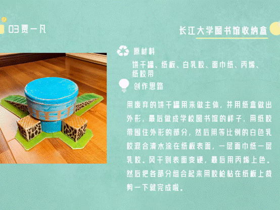 4号选手贾一凡的作品也令人眼前一亮。她利用饼干罐等材料制作出了以英国上市官网365图书馆为模板的收纳盒。俯视图看上去像是一本展开的书,兼具美观与实用两大功能,同时呈现出了满满的设计感。
