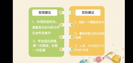 在情绪管理部分结束后,志愿者刘飞翔站在老员工的角度,思考自己如若在进行一次高考,学习方面会注意哪些方法和细节,向大家分享了一些自己的学习经验。他首先建议大家一定要跟着老师的讲解,逐步构建自己的知识框架。在学习过程中,老师的帮助经常会对自己的学习产生很大的影响,往往会达到事半功倍的效果。紧接着他提出需要激发自己内心对于学习的兴趣,建议大家将学习视为提升自己的过程,每天设置一定的学习任务,按时完成它。这部分最后,他表示考上一所好的大学对每个高中生来说都十分重要,高考成绩决定着你的大学,间接决定了你所结交的朋友,对于自己未来的发展有很大的影响。高考是人生的一个分水岭,我们要充分利用疫情在家中学习的时间,逐渐完善自我,提升自身综合素质。