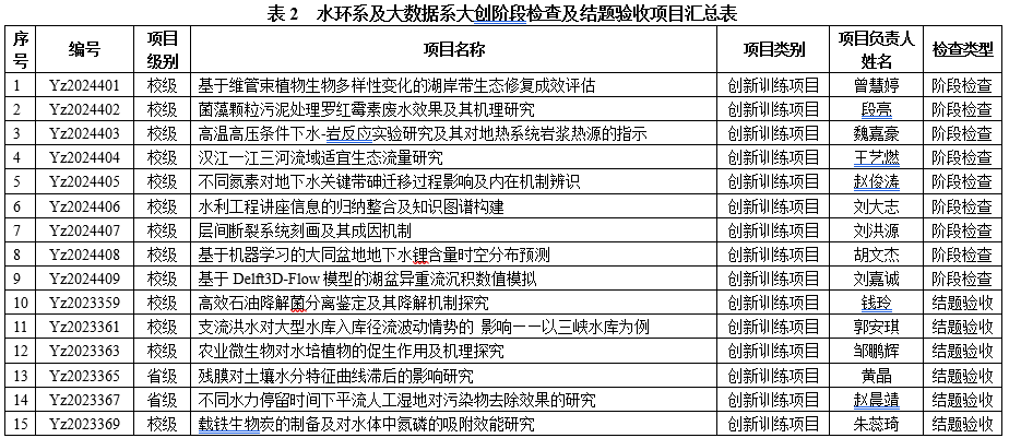项目明细详见表2水环系及大数据系大创阶段检查及结题验收项目汇总表。